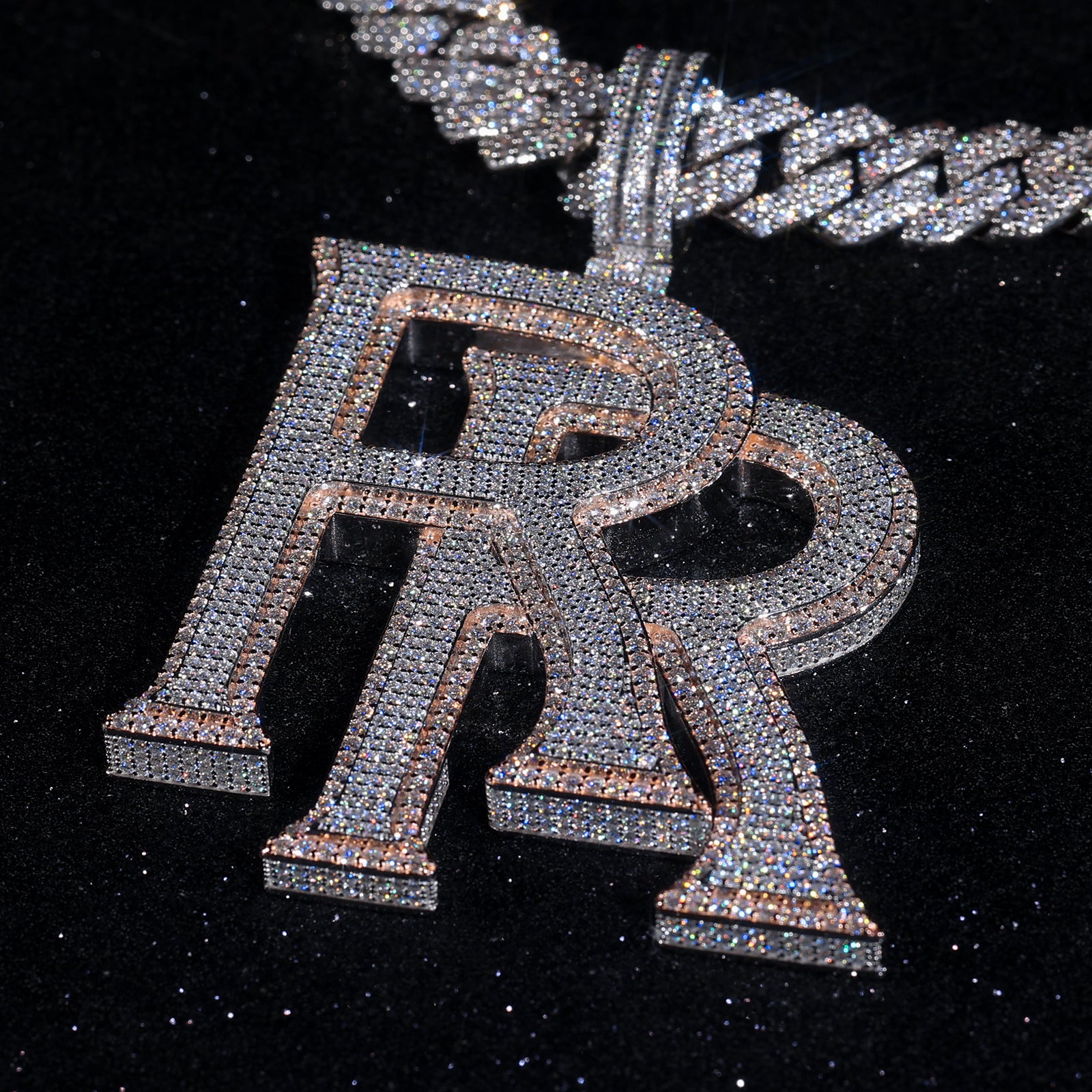 Level up your game with this masterpiece iced out RR pendant and let your custom RR pendant reflect true hip hop luxury.