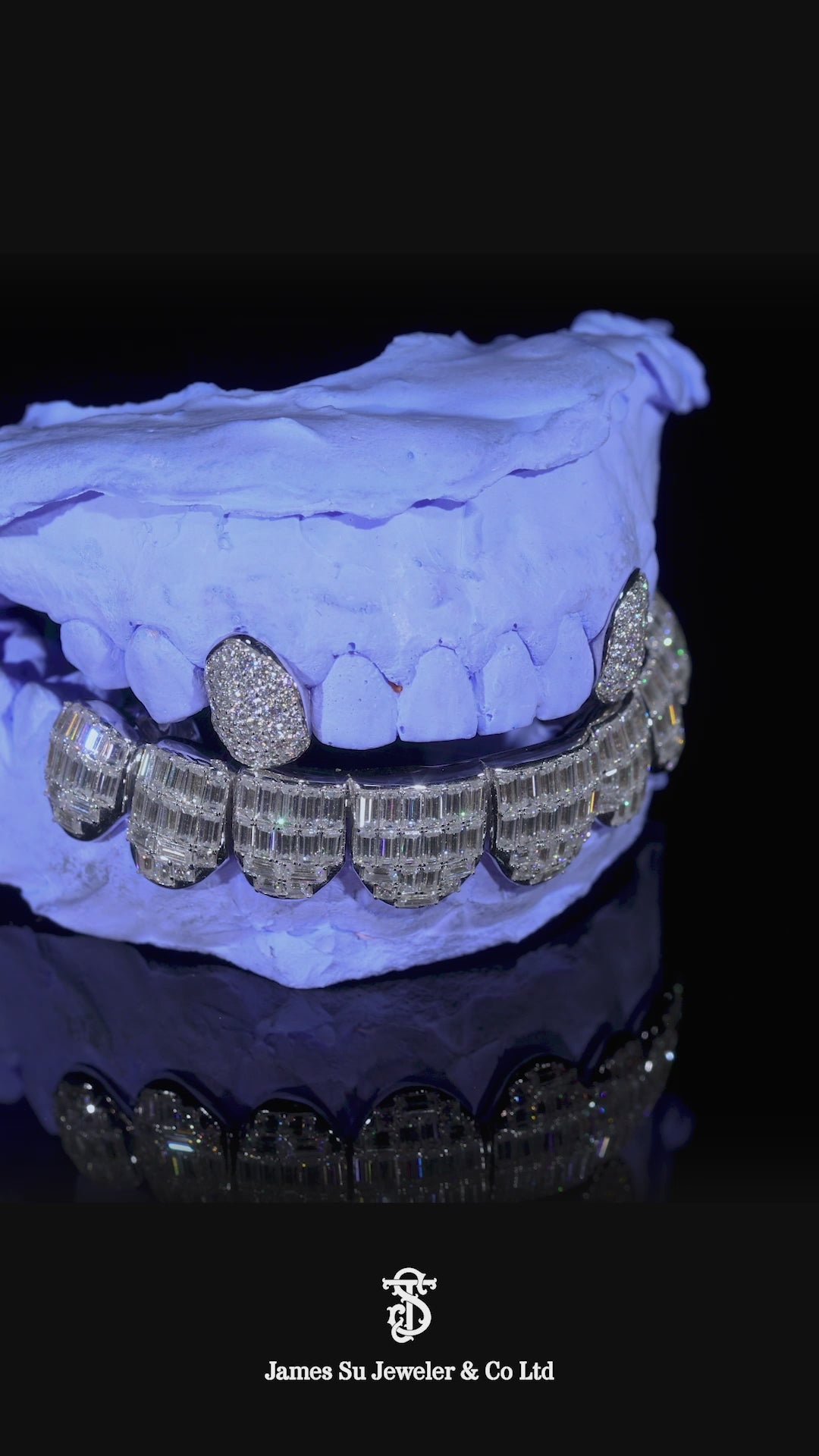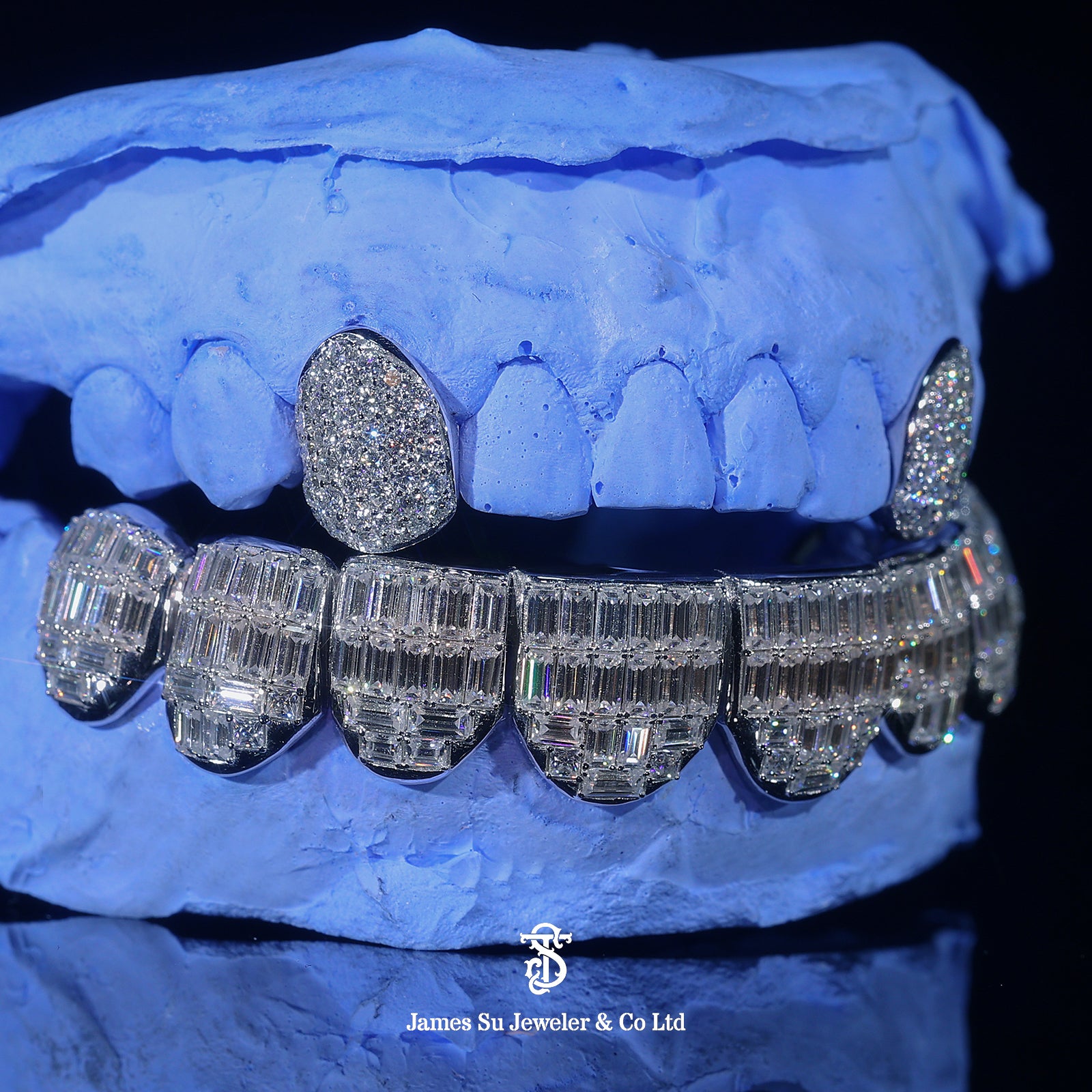 The upper row features precision-crafted diamond fang caps, fully flooded to shimmer with every movement. The lower row commands respect with a solid "wall of ice" made of hand-set baguette diamonds, offering a mirror-like reflection that round stones simply can't match.