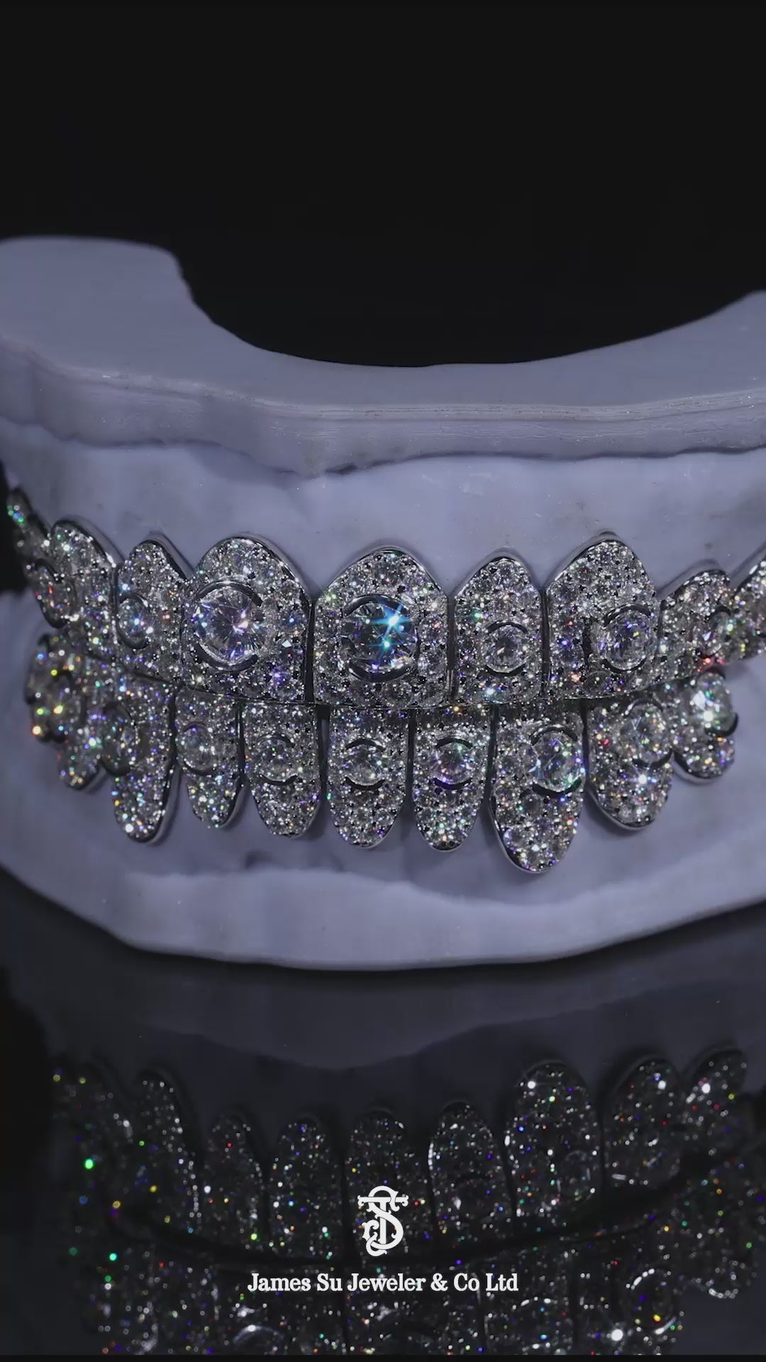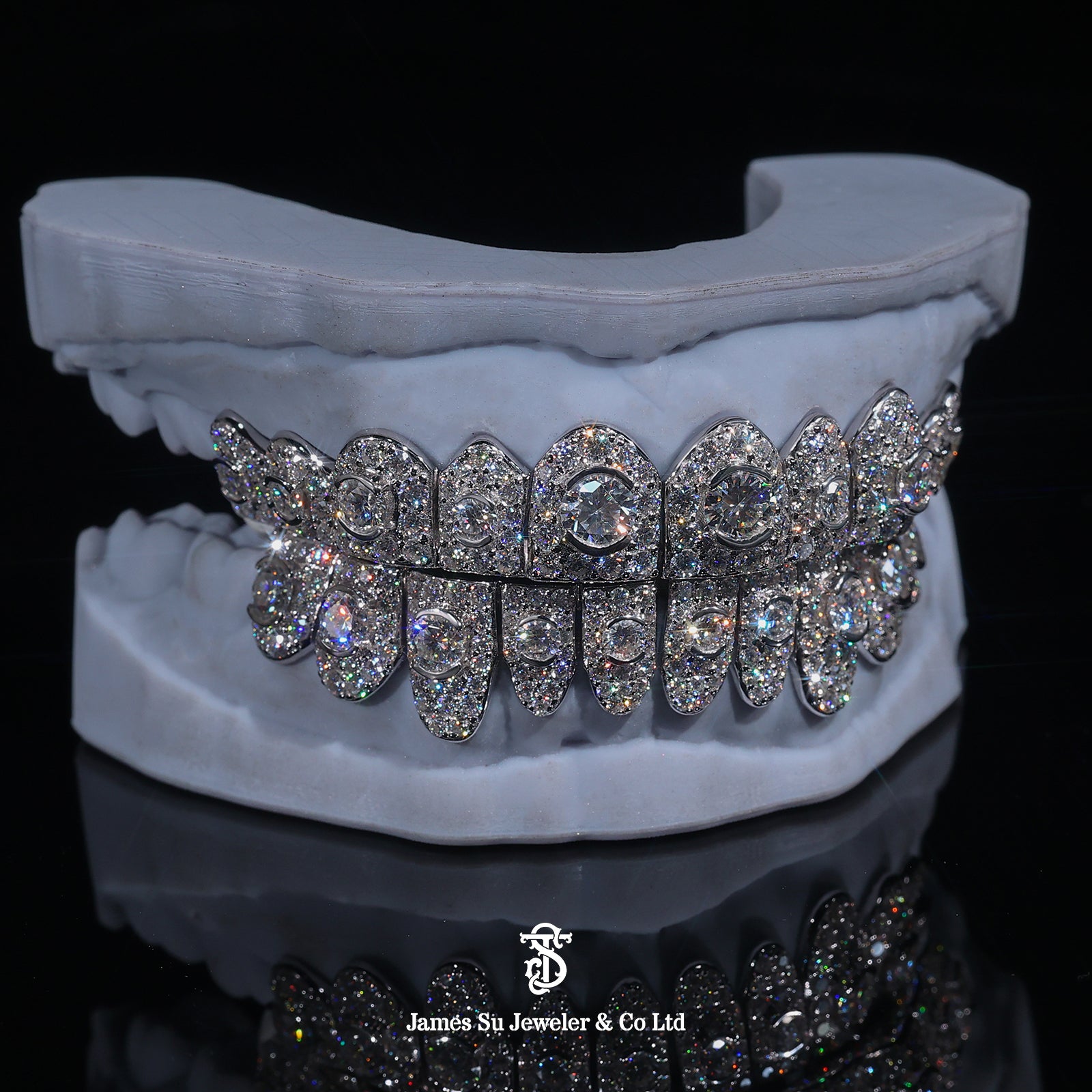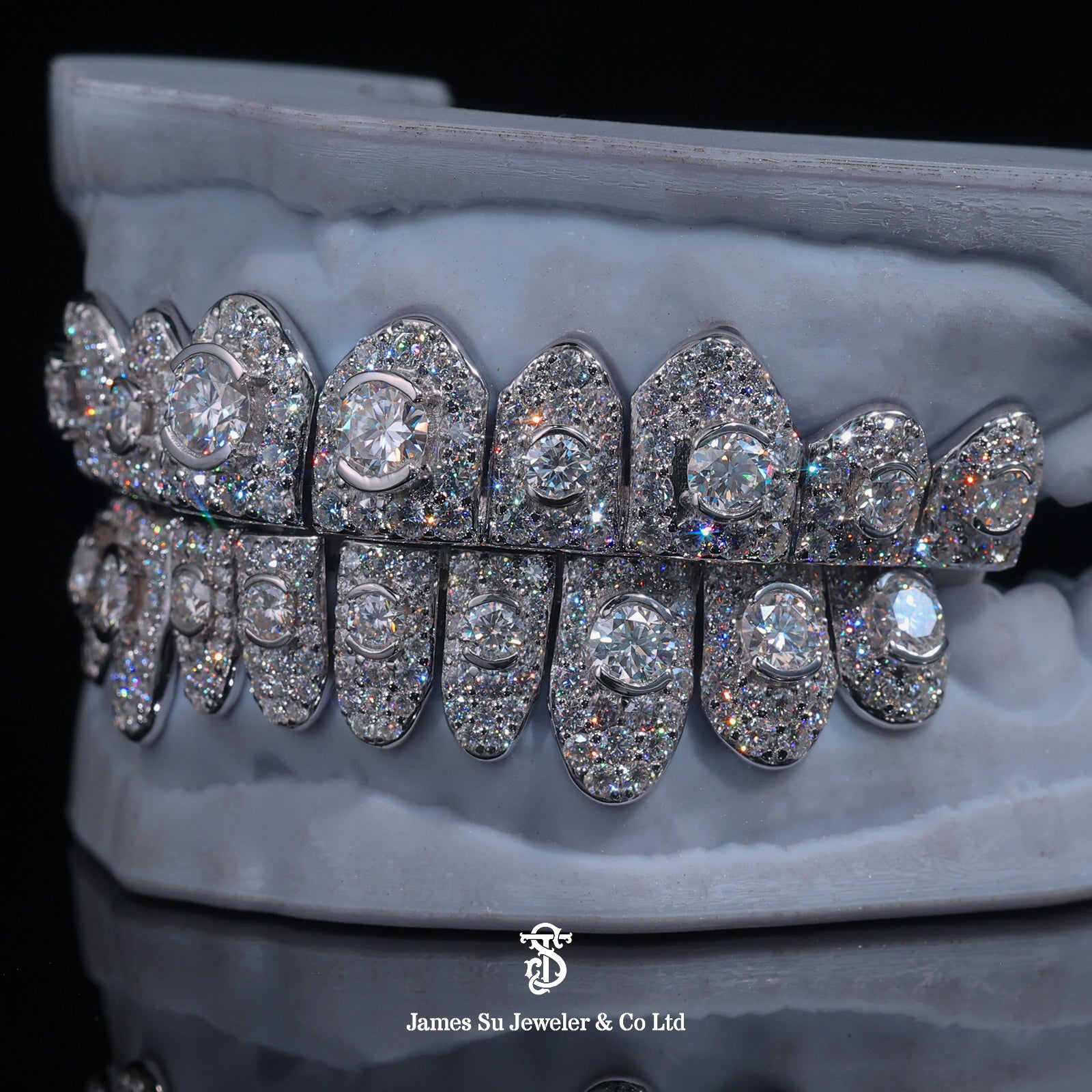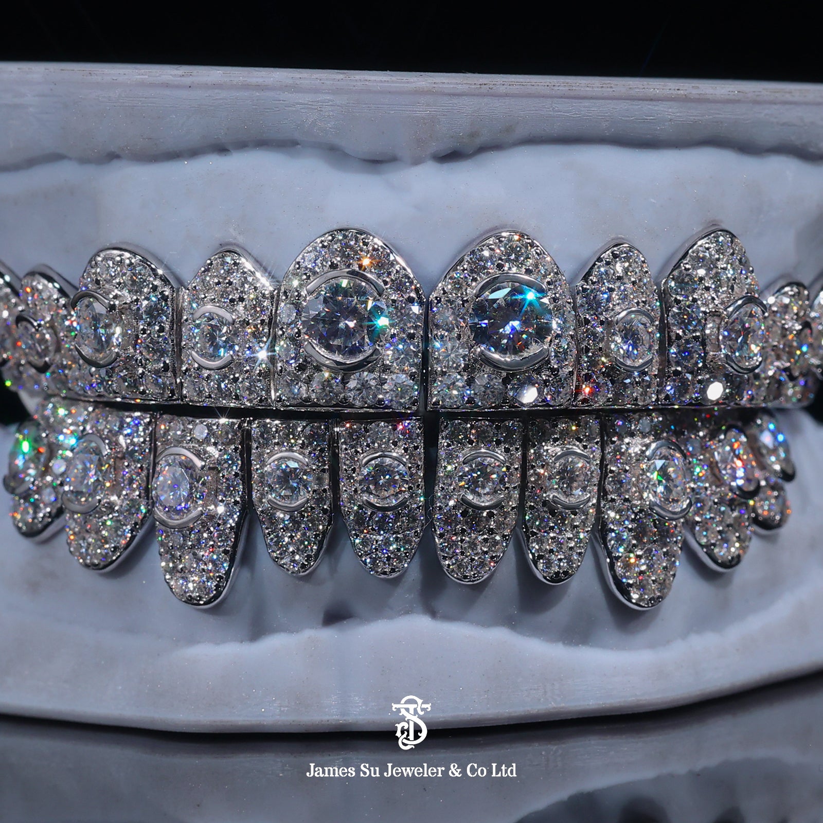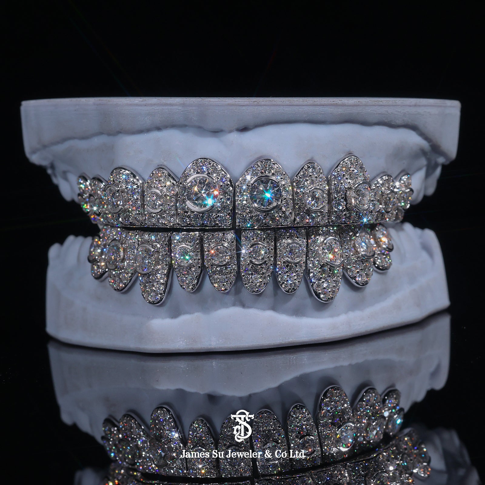 Breaking the boundaries of traditional hip-hop grillz, this set features massive, high-clarity center stones on every single tooth. Each "Big Rock" is meticulously framed by a halo of micro-pave diamonds, creating a layered, multi-dimensional fire that can be seen from across the room.